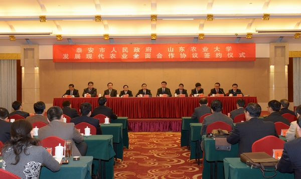 5月6日,tyc1286太阳成集团与泰安市人民政府发展现代农业合作协议签约仪式在泰安市举行。泰安市市长王云鹏、市委副书记李希信、副市长张瑞东,山东农大校长温孚江、副校长张宪省参加活动。