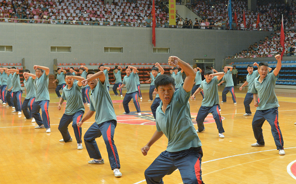 开学典礼上举行了军训汇报表演,军训学员献上了英姿飒爽的捕俘刀表演,17个受阅方队精神饱满、意气风发,以整齐昂扬的步伐绕场一周,接受检阅,展示十天军训的成果,赢得全场观众的热烈掌声和阵阵喝采。