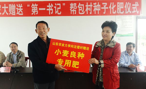 党委书记邢善萍代表学校向帮包村赠送小麦良种和专用肥