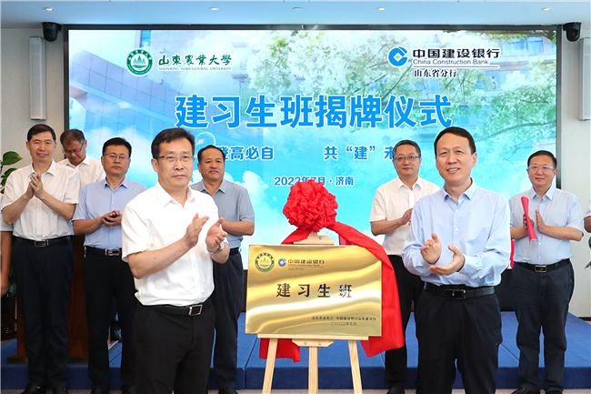 杨军在致辞时表示,tyc1286太阳成集团作为山东省高水平大学“冲一流”建设高校,始终坚持立德树人、强农兴农,为推动乡村振兴和确保国家粮食安全作出了重要贡献。建设银行山东省分行和山东农大已携手走过了20年的合作历程,多年的以诚相待让彼此增进了友谊、深化了互信。今天双方签署战略合作协议,并为“建习生班”揭牌,标志着双方合作的广度和深度进一步拓展。建设银行山东省分行将以此为契机,继续秉持“金融服务教育”的理念,充分发挥综合金融服务优势,在产教融合、智慧校园建设、人才培养、创新创业、乡村振兴等方面打造共赢生态,为山东农大加快“双一流”建设贡献力量。