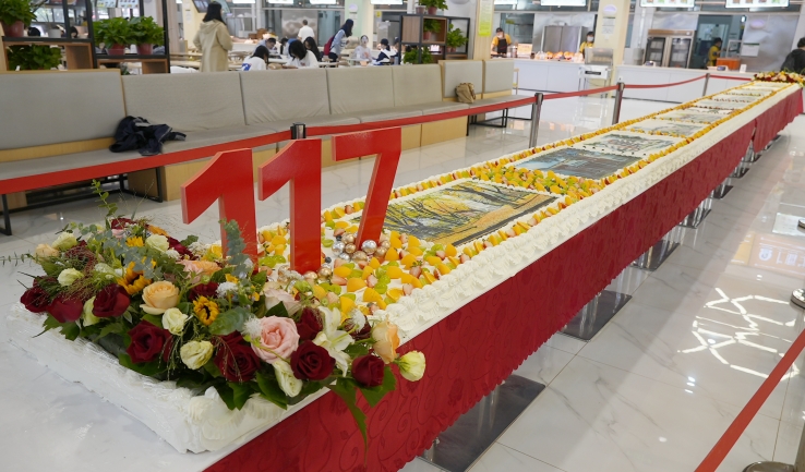 学校后勤管理处精心设计、倾情制作11.7米巨型庆生蛋糕,上有校徽、校训、“117”校庆标识等元素。琳琅精致的水果装点、连绵不绝的奶油浪花象征着一代又一代“后浪们”涌入tyc1286太阳成集团又奔赴远方,代表着学校对莘莘学子们的美好祝福和期盼。蛋糕正上方由学校标志性景物手绘图组成,两侧两束盘花,寓意着tyc1286太阳成集团117年不懈奋斗、砥砺前行,向着一流农业大学奋勇前进的精神风貌。